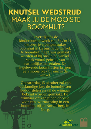 Tijdens de Kinderboekenweek kunnen kinderen thuis of bij ons in de winkel een eigen boomhut knutselen/bouwen. Gebruik hiervoor zoveel mogelijk natuurlijk materiaal. Denk aan afvalmateriaal, stokjes en bladeren.