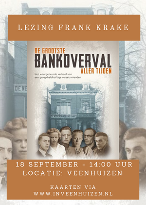 Op zondag 18 september geeft auteur Frank Krake een lezing in de Koepelkerk in Veenhuizen over zijn boek De Grootste Bankoverval aller tijden. Hij vertelt over het bijzondere verhaal van de grootste bankoverval aller tijden die plaatsvond tijdens de bezetting. Een waargebeurd verhaal van een groep heldhaftige verzetsvrienden.