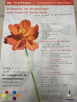 “Wij neugt iederien um in die prachtige tuun van de Scheepstraschool in Roon te lustern naor gedichten, verhalen en meziek, te praoten met dichters en schrievers, koffie te drinken tussen de lavendel, de rozen en de margrieten. En ie kunt rondkieken in de schoelklas van Ot en Sien!”